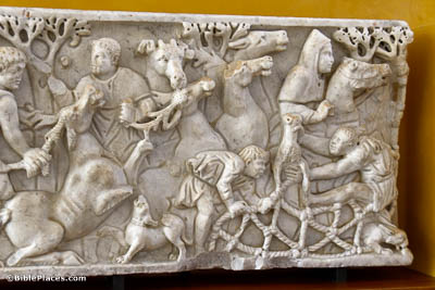 The word “snare” refers to a rope or noose used to restrain. This relief shows men catching deer with a net. Several of the men are shown grasping deer by their antlers or heads, an easy way to control them once they have been caught. However, the word “snare” could also refer to a restraint like a halter or bridle on a horse, used to restrain and then direct the animal.