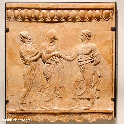 Marriage or the marriage relationship was often indicated in Greco-Roman art by the clasping of hands between a man and woman. The terracotta plaque shown here is thought to depict the wedding of Thetis and Peleus, the parents of Achilles in Greek mythology.