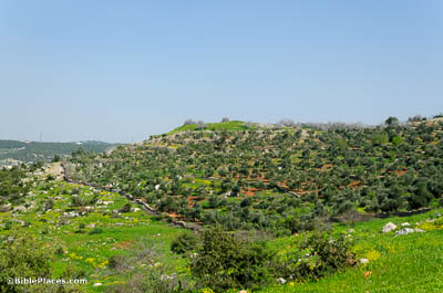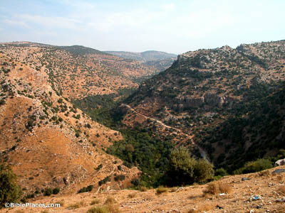 Many scholars identify the Brook of Cherith with Wadi Yabes (Wadi Al-Yabis, Wadi Al-Rayyan), which is located a few miles north of Mar Elias. This western end of this canyon, before it empties onto the Jordan Valley floor, is rocky, steep sided, and nearly impassable. The distance from Samaria to the mouth of Wadi Yabes depicted here is roughly 30 miles (50 km).