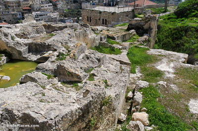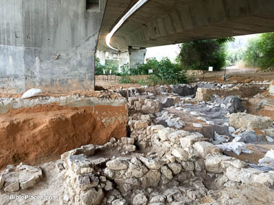 The main rectangular building of the temple (porch, holy place, holy of holies) was surrounded by an outer wall that created several stories of auxiliary rooms around the temple, which were most likely used for storing cultic instruments and materials (cf. 2 Chr 5:5-7). Three examples of similar auxiliary rooms have been found, including the one shown here: the temple at Tel Moza. This view is taken from the courtyard. The sacrificial altar is visible on the right, and the doorway of the temple is visible just to the right of center. The stone walls visible in the foreground are from a later structure (8th century BC) built along the south side of the courtyard.