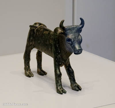 This bronze figurine of a bull is a Canaanite symbol of fertility, sometimes associated with the worship of the storm god Baal. It was found at an open-air ritual site in the Israelite heartland, most likely built by Israelites. It is reminiscent of the golden calves installed at the worship centers of Dan and Bethel by the Israelite king Jeroboam I (1 Kgs 12:28-29).