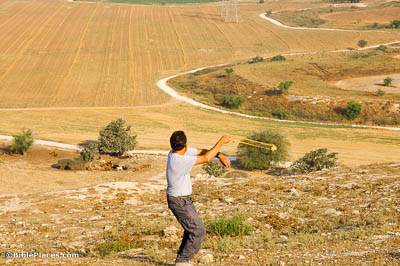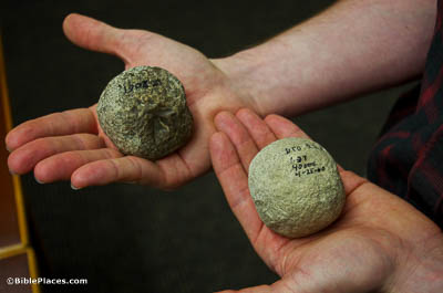 Contrary to popular conception, sling stones were not small, but were about the size of a baseball or a fist. Hundreds or thousands of ancient sling stones have been discovered in Israel. These two sling stones were photographed at the Wheaton Archaeology Museum.