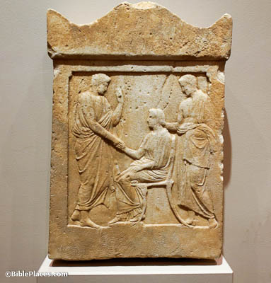 The word “overseer” (Gk. episkopē) literally means to “look” (scope) ”on” (epi). This concept comes from the office of someone in charge who would watch over a group. The funerary stele pictured here illustrates the literal configuration of this concept with an overseer literally looking over workers from above as they carry out their construction tasks. This concept was extended to the office of “overseer” (also called “shepherd” or ”pastor”, e.g., Eph. 4:11) in the church as one responsible for the congregation, not only to make sure they are carrying out their Christian duties properly, but also to look out for their best interests and protection (cf. Acts 20:28).