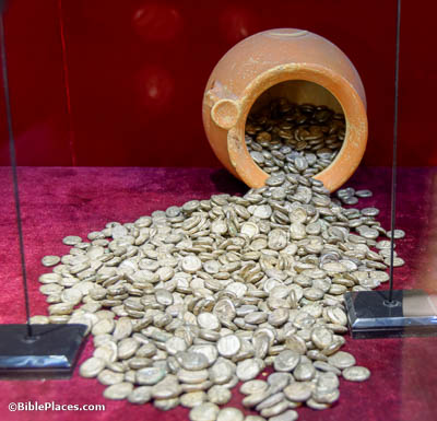 Given the context, the “contribution” mentioned here is clearly a collection of money to be used for other churches. It is usually considered to be the collection of money also mentioned in Acts 24:17, 1 Corinthians 16:3, and 2 Corinthians 8:4, 18-19. Carrying this large collection of money may have been one of the factors in Paul’s decision to double back through Macedonia by land to Jerusalem (Acts 20:3) instead of by sea from Corinth. Even though this had been his return route previously (Acts 18:18), a long voyage on the open sea carried too much of a risk that the money might be lost. This hoard of Greek silver coins is slightly earlier than the time of Paul.