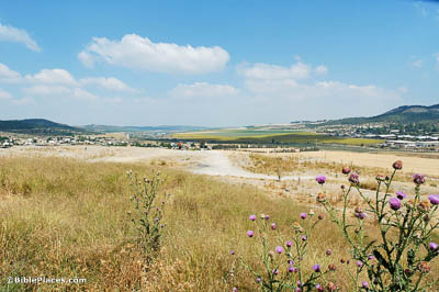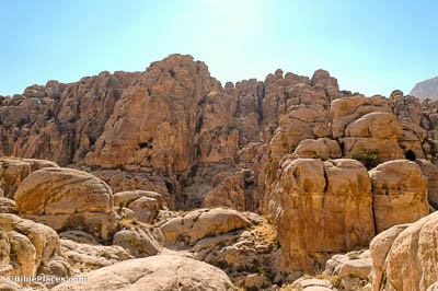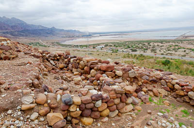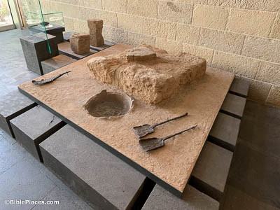 This display includes a small altar made of five stones that was recovered from the 8th century BC high place at Tel Dan. The long-handled shovels were found next to it. Numerous long-handled shovels of this sort have been discovered in cultic settings from ancient Israel and the surrounding regions. They were probably used to collect live coals from a fire, which were then brought within the temple to have incense added, producing a fragrant smoke. This display was photographed at the Skirball Museum in Jerusalem.