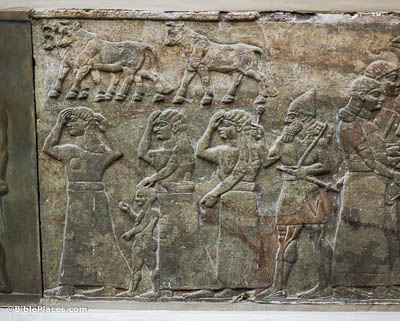 The Assyrians had a long-standing tradition of deporting conquered people and replacing them with different conquered groups. This relief from the early 9th century BC depicts three women and a child (along with the livestock shown above them) being deported after their city was conquered. The women each have a hand over their head, a sign of grief and mourning. This relief comes from the palace of Ashurnasirpal II at Nimrud. It was photographed at the British Museum.
