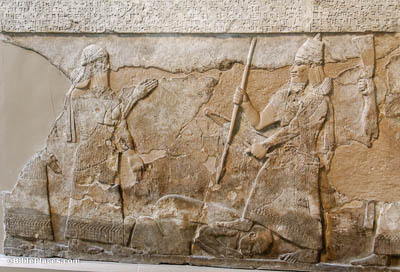 The Assyrian king mentioned here is Shalmaneser V (r. 727–722 BC). He was the son of Tiglath-pileser III. His rule was relatively short, his end was probably violent, and his successor Sargon II (r. 722–705 BC) may have been unrelated to the royal family. It is not certain that any depictions of Shalmaneser V have been found. This relief depicts Tiglath-pileser with his foot on the neck of a captured enemy; it is possible that the man facing him, with upraised hand, is the crown prince Shalmaneser V.