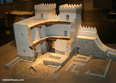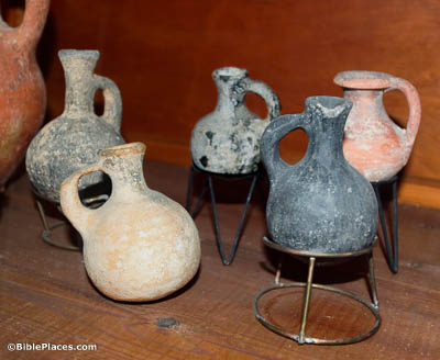 The flask of oil seems to be distinct from the “horn” of oil used for anointing in other passages (1 Sam 16:13; 1 Kgs 1:39), although the function seems to be identical. Small juglets like the ones in this photo were commonly used to hold olive oil, and this would have been an ideal size for a runner to carry. This display was photographed at the Pontifical Biblical Institute Museum in Jerusalem.
