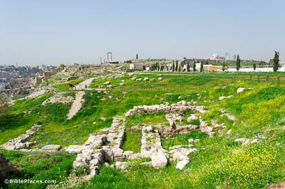 Rabbah (aka Rabbath Ammon) was the capital city of the Ammonites. It was located at the heart of what is now the modern city of Amman, Jordan. The most extensive Iron Age remains to be uncovered at Rabbah so far is the structure shown here. Dating to about 800 BC, it consists of a large structure with thick walls, surrounding a plastered courtyard. Archaeologists have interpreted it as an Ammonite palace.