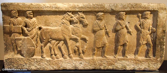 Many of the issues that required legal judgment in the Roman system were handled by magistrates. This relief shows a magistrate in his chariot followed by a scribe. In front of the chariot are his two lieutenants (lictors), carrying fasces (a bundle of rods with a projecting ax blade, carried as a symbol of a magistrate’s power). This sarcophagus was photographed at the Vatican Museums.