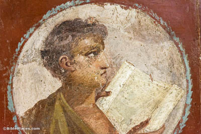 The “books” used at this time were almost exclusively scrolls, made of either parchment or papyrus. The codex (a bound book with pages) was a recent invention that was quite rare and only gained popularity when it began to be used for Christian writings in the succeeding centuries. This 1st-century AD fresco from Herculaneum shows a young man reading a typical “book” of the time, a scroll.