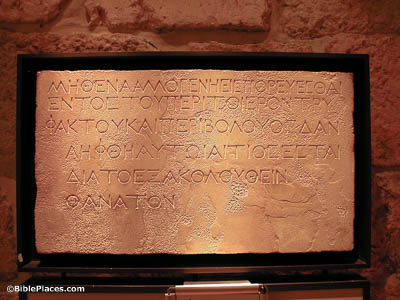 This is a replica of a warning inscription once stood on the Temple Mount at the fence between the Court of the Gentiles and the temple proper. It forbade foreigners from entering. It reads, “No foreigner is to enter the balustrade and enclosure around the temple. Whoever is caught will himself be the cause for [his] following death.” It is this law that Paul was falsely accused of violating, leading to his being beaten and arrested.