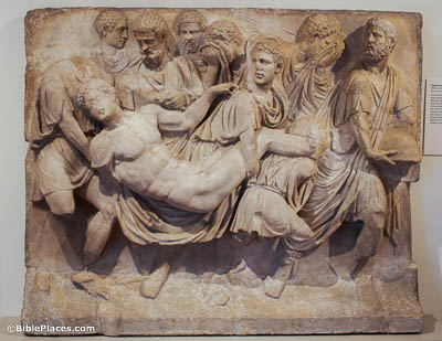 Here, a group of mourners is depicted carrying the body of a deceased man. The scene comes from a marble sarcophagus made in the middle of the 2nd century AD. It serves to demonstrate something of the “great fear” provoked by the deaths of Ananias and Sapphira.