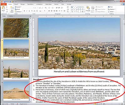 Biblical, historical, geographical, and archaeological notes are included in the “Speaker’s Notes” section of the PowerPoint presentations. This allows the association of annotations with specific sites and photographs. This has the additional advantage of working across different operating platforms (e.g., PC, Mac), but it requires a full version of the PowerPoint program or Keynote. Alternative programs to PowerPoint may not display the “Speaker’s Notes” properly.