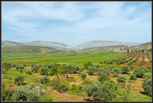 After traveling 400 miles (640 km) from Haran, Abram and Sarai arrived at Shechem (Gen 12:6). Here God promised to give the land to Abram’s seed. Shechem is located in Israel’s central hill country, between Jerusalem and Galilee, flanked by Mount Gerizim on the south (left) and Mount Ebal on the north (right).