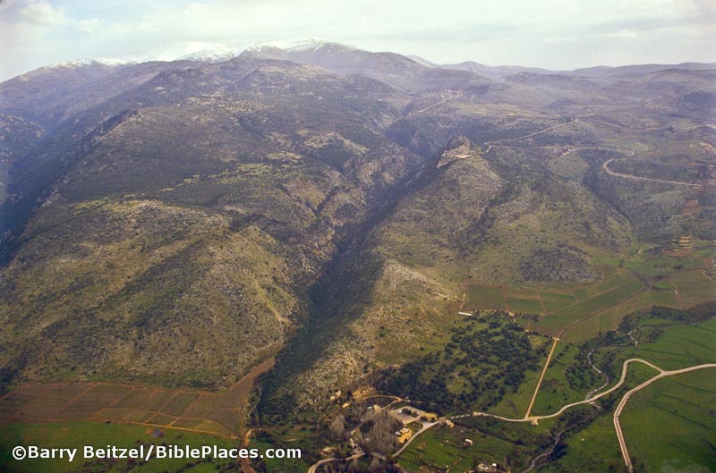 In this photo, the immense size of Mount Hermon can be clearly seen while it dwarfs the remains of the ancient city of Caesarea Philippi (located at the bottom center of the photo). The ruins of the Crusader period castle of Nimrud can also be seen sitting on the ridge above Caesarea Philippi in the upper right quadrant of the photo.