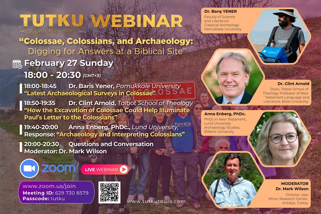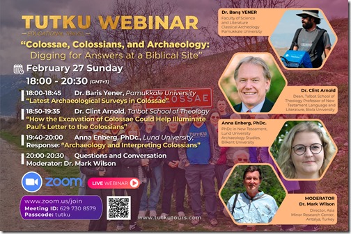 Tutku Tours is sponsoring a webinar on February 27 entitled “Colossae, Colossians, and Archaeology: Digging for Answers at a Biblical Site,” with Mark Wilson moderating. The graphic (below) provides full details, but I’ve written out the schedule here, with times in US Eastern:
