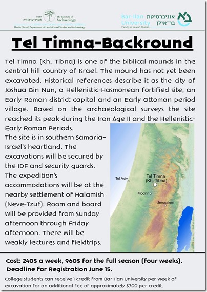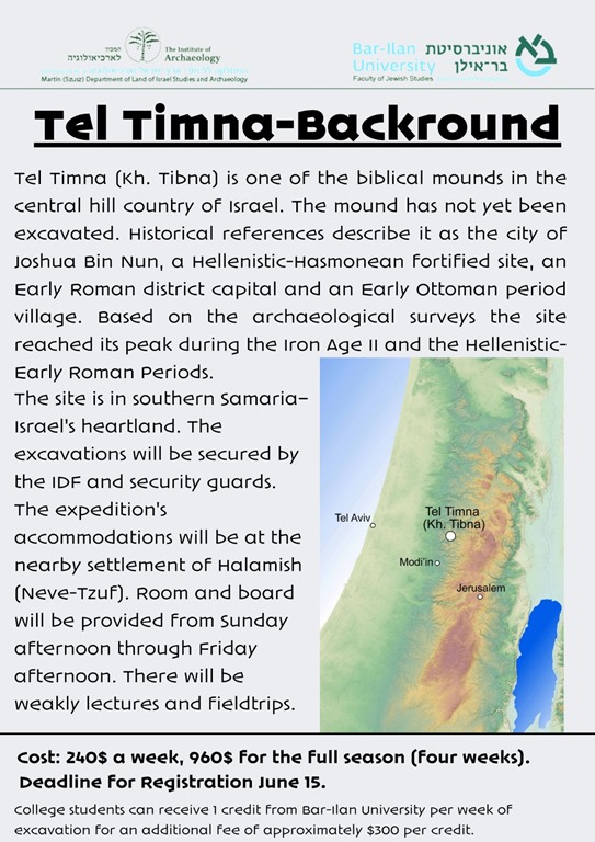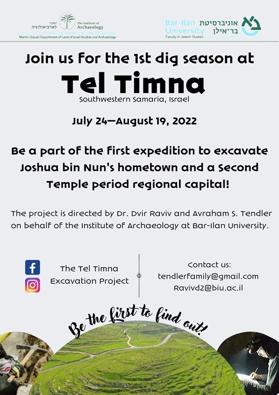 There’s a brand new excavation opportunity this summer at a site usually identified with Joshua’s hometown of Timnath Heres. The site of Kh. Tibna/Tel Timna has never before been excavated, and this July Dvir Raviv and Avraham Tendler of Bar Ilan University are launching an excavation and survey project in the western hill country of Ephraim.