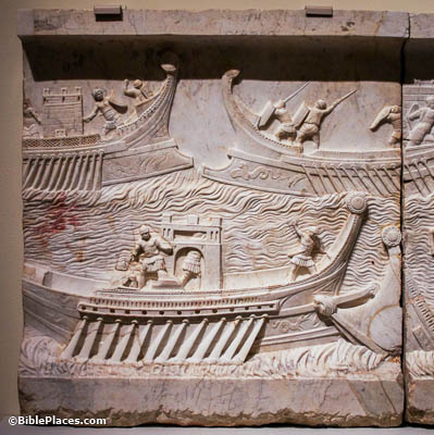 The “ships of Kittim” were apparently ships from Rome. Antiochus IV’s ambition led him to take bold actions which were strongly rebuffed by Rome. He brought his armies all the way through Egypt to Alexandria, but before he could launch his assault on the city, ships arrived from Rome with an envoy who confronted Antiochus. Antiochus ultimately acquiesced to the Roman demand and withdrew from Egypt. This relief from the 1st century AD dates a little after these events, but it serves to illustrate what Roman warships looked like.