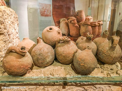 This picture shows jugs, likely for exporting fine oil. These jugs are Cypro-Phoenician and date to the 11th–8th centuries BC. Solomon’s lifetime is within this range of time and he traded with Phoenicia, so Solomon may very well have seen jugs like these filled with precious oil. This photograph was taken at the Hecht Museum at the University of Haifa.