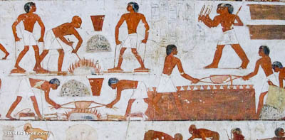 This relief shows various steps in the process of refining ore to metal in an Egyptian workshop. There are two sets of men at the left who are working the bellows for furnaces, using foot-powered pumps. On the right they are pouring molten metal into molds. This wall painting is located in the tomb of Rekhmire, the “Governor of the Town” at Thebes (modern Luxor).