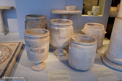 Stone jars were more expensive than those made of pottery. They were, however, were vastly more convenient for Jewish households, because (unlike other materials) they could be purified after ritual defilement, according to rabbinic rulings. Hundreds of such water jars have been discovered in Galilee and Jerusalem. The display shown here is located in the Israel Museum.