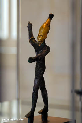 Baal was perhaps the most commonly worshipped of the Canaanite gods. He appeared in a number of different regions with slight variations; often he was considered a weather god, since weather (particularly rain or drought) was critical to survival in that region. Baal was most typically depicted in a smiting pose, standing (or more commonly, striding forward) with his right hand upraised and his left thrust forward. The tall crown/hat is also typical of Baal, although similar headdresses were used for other gods as well.