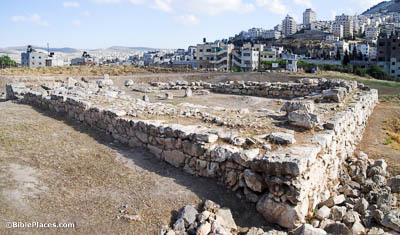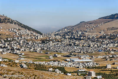 The ancient city of Shechem is nestled between Mount Gerizim on the south and Mount Ebal on the north. Although not easily defended, the city is well-situated because of the fertile valleys, springs, and communication routes surrounding it. Today it is surrounded by the modern city of Nablus.