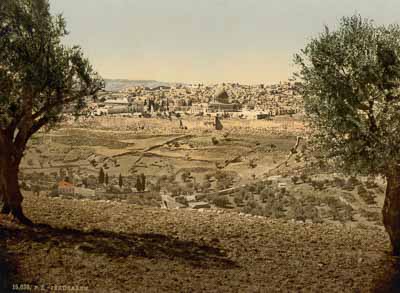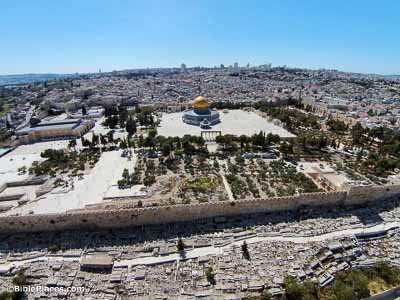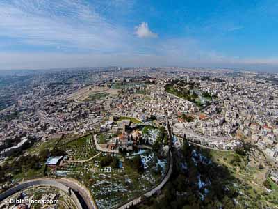 Bethany is about two miles (3 km) from Jerusalem, and the walk would normally take an hour, at most. This view of the Mount of Olives, looking out in the direction of Jerusalem, includes the modern path that winds over the summit. It likely follows a route similar to the ancient one that Jesus used.