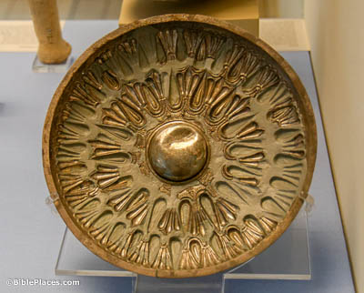 In Revelation 15:7, each of the seven angels was given a golden bowl (Gk. phialē) full of the wrath of God. The picture seems to be similar to the common practice of the 1st century (and much earlier, and for several centuries afterward) of using a shallow bowl to pour out a libation offering on a burning altar. This silver libation bowl from Ithaka was photographed at the British Museum.