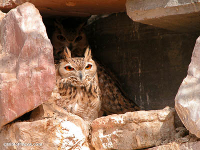 Inhabitation by birds, sometimes with other animals, expresses desolation of a city in various prophetic texts, such as Isaiah 13:21, 34:11, and Zephaniah 2:14. Notably the birds mentioned in these texts, such as the owl, are unclean according to Leviticus. This picture shows an eagle owl, an unclean bird, at the Yotvata Haibar Nature Reserve.