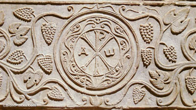 Alpha and omega are the first and last letters of the Greek alphabet. The symbol on this Christian sarcophagus consists of four Greek letters. At the center of the circle, a chi (Χ) is superimposed over a rho (Ρ); these are the first two letters in the name “Christ” (Gk. ΧΡΙΣΤΟΣ). This symbol is flanked by the alpha (Α) and omega (Ω, alternately shaped, as here, like a W). This title for God, referring to Him as the alpha and omega, that is, the first and the last, occurs only in Revelation, and it is claimed by both the Father (1:8) and the Son (22:13).