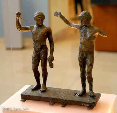Boasting (Gk. kauchēsis) was an act of pride. In 1 Thessalonians 2:19, Paul spoke of his “crown of boasting,” which was the church at Thessalonica. Both passages fit well in an athletic setting, where the victor boasts of his accomplishment. This is illustrated by this bronze statue of two athletes shown boasting of their victory. Their upraised arms likely once held delicate olive leaf crowns, a common prize for the winner of an athletic competition.