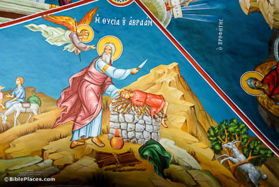 One of the most notable acts of obedience Abraham rendered to God was his willingness to offer his only son Isaac on or near Mount Moriah, where the Temple would later be built by Solomon (Gen 22:1-18; 2 Chr 3:1). Paul poses this rhetorical question to introduce the cases of Abraham and later David as proof of his claim that justification is by faith alone. Justification cannot be merited on the basis of our obedience, which Paul has previously shown to be already forfeit by fallen humanity (Rom 3:9-18). This painting was photographed at Mar Saba, a monastery in the Judean wilderness that was founded in the 5th century AD.