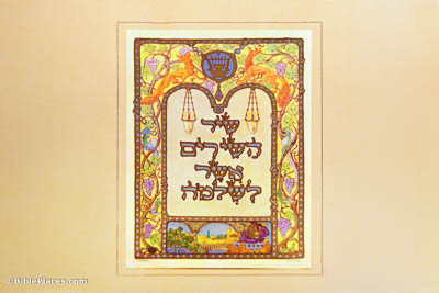The first verse of the book is its title. The two most common names of the book, “Song of Songs” and “Song of Solomon,” both derive from this title. The book is sometimes referred to as “Canticles,” a name that derives from the Latin Vulgate (meaning “song”). This artwork is an illustration of Song of Songs by Ze’ev Raban. It gives the text of the entire verse (only four words in Hebrew). This artwork was photographed at a special Menorah Exhibit at the Vatican Museums. Ze’ev Raban was a Polish Jew and one of the founders of the Israeli art world.